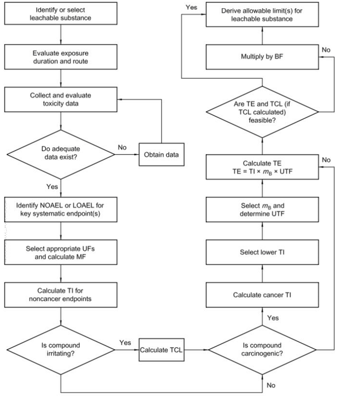 特定的可瀝濾物的總容許限值可以由三部分組成:即短期限值、延長限值和壽命限值。所以,可能需要考慮多種暴露途徑下每種限值的情況。為此,針對每種使用類別中的每種接觸途徑,分別計算容許攝入量(TI)。在很多情況下,允許將最低TI值用于不同的使用類別和暴露途徑,這樣最能代表可瀝濾物的毒理作用。