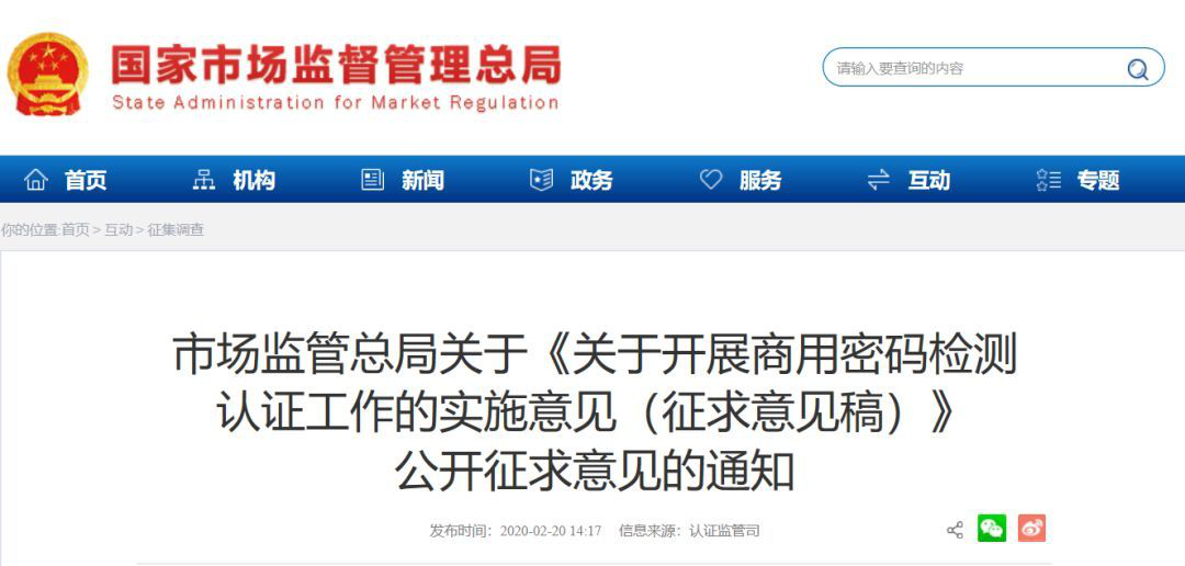 據該通知,為推進商用密碼檢測認證體系建設,促進商用密碼產業健康有序發展,根據《中華人民共和國產品質量法》《中華人民共和國密碼法》和《中華人民共和國認證認可條例》,市場監管總局、國家密碼管理局聯合起草了《關于開展商用密碼檢測認證工作的實施意見(征求意見稿)》,現正向社會公開征求意見。各有關單位或個人提出修改意見,可于2020年3月6日前反饋市場監管總局。
