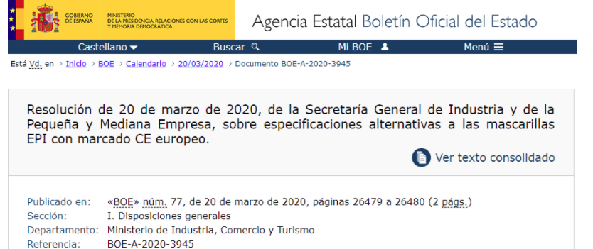 針對新冠肺炎疫情期間帶CE標(biāo)識的個人防護(hù)用品市場短缺的現(xiàn)狀,近日,西班牙工業(yè)和中小企業(yè)部發(fā)布決議,公布中國口罩相關(guān)標(biāo)準(zhǔn)可替代歐洲標(biāo)準(zhǔn)。