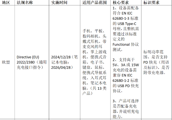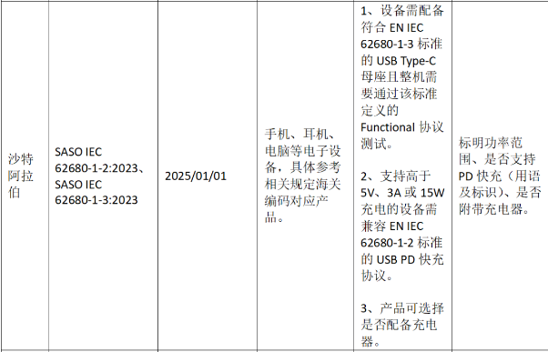 沙特阿拉伯、美國(guó)加州、印度等國(guó)家和地區(qū)也已出臺(tái)相關(guān)法律法規(guī),明確實(shí)施時(shí)間和要求。各國(guó)對(duì)Type-C充電器的法規(guī)要求整理如下: