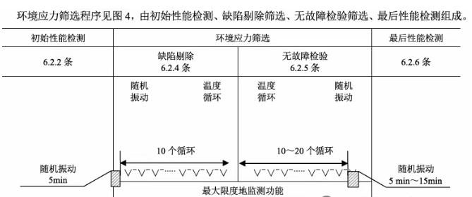 篩選過程中應(yīng)對產(chǎn)品的功能和性能進(jìn)行監(jiān)測,在最長 20個循環(huán)內(nèi)只要連續(xù)10個循環(huán)不出現(xiàn)故障,產(chǎn)品即通過了溫度循環(huán)篩選;在最長15min內(nèi)連續(xù) 5min不出現(xiàn)故障,產(chǎn)品即通過了隨機(jī)振動篩選。