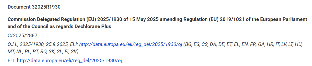 2025年9月25日,歐盟在其官方公報發布修訂法規(EU) 2025/1930,在POPs法規(EU)2019/1021附錄I新增德克隆的限制。至此,POPs法規附錄I的A部分限制的物質達到32項。修訂法規于歐盟官方公報上公布后第20日起生效。
