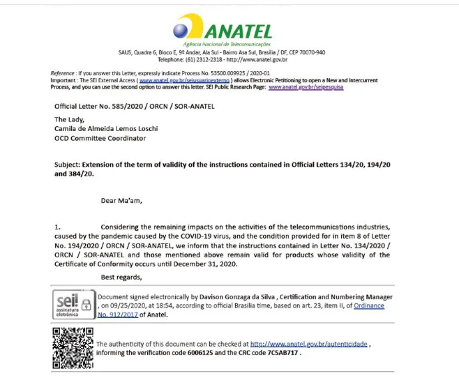 2020年9月27日,巴西國家通訊管理局(ANATEL)發(fā)布了官方通函NO.585/2020。該函表示因受新冠肺炎COVID-19的持續(xù)影響,ANATEL決定延長執(zhí)行134/20、194/20和384/20號通函中提及的證書更新的簡化流程。