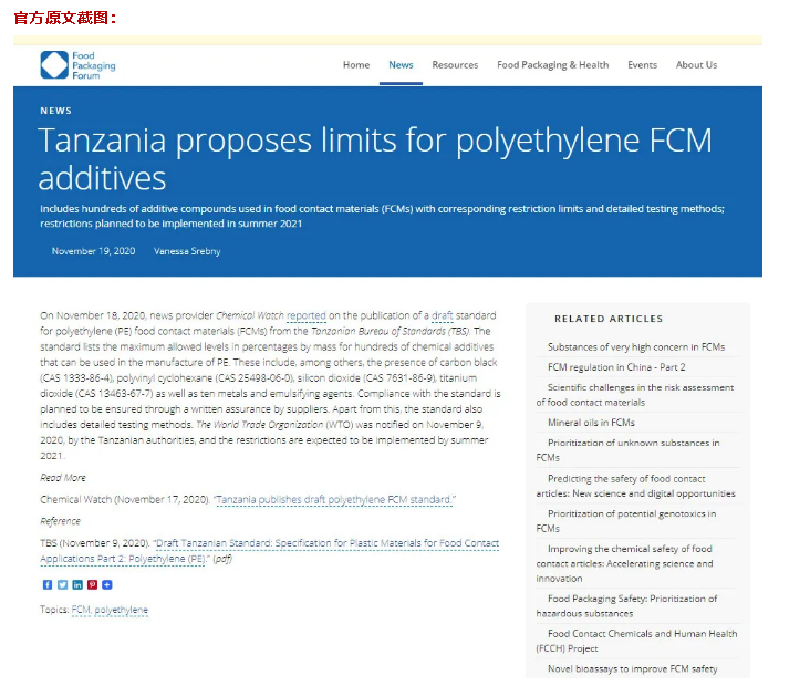 2020年11月18日,據(jù)化學觀察報道,坦桑尼亞標準局(TBS)發(fā)布食品接觸材料(FCMs)聚乙烯(PE)標準草案。