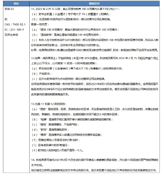 2021年1月26日,歐盟在其官方公報發布(EU) 2021/57法規,再次更新REACH附錄XVII第63條目關于鉛的要求,將其適用范圍擴大到在濕地內或附近使用的射擊彈藥。該法規將自歐盟官方公報上發布之日起20天內生效。