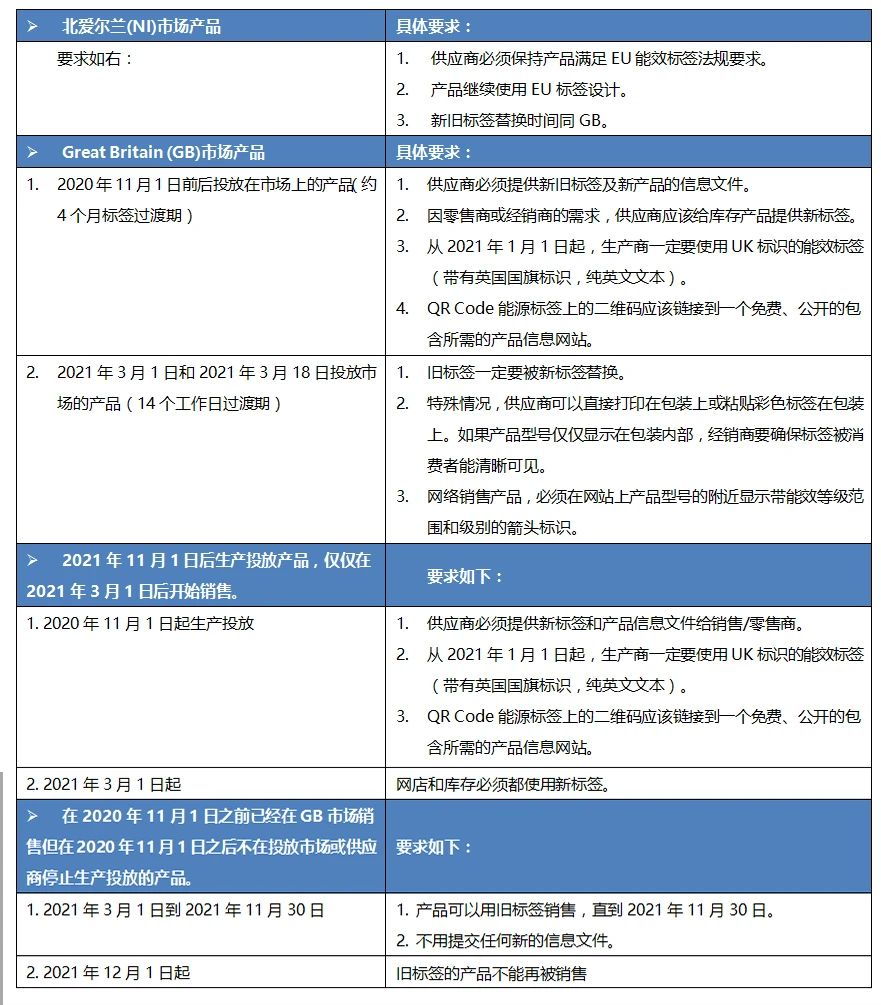 英國脫歐后,英國政府致力于繼續支持消費者通過購買節能產品來節約能源。英國商業、能源和工業戰略部(Department for Business, Energy and Industrial Strategy)與利益相關者協商,決定繼續使用能源標簽。現代技術創新日新月異的發展,使產品比5-10年前更節能,更高效,這意味著不能再用原有相同的尺度來衡量能效。因此,能源標簽等級被重新設置,以更清楚地顯示當今產品之間的效率差異。英國在脫歐前就采用了歐盟的規定,因此,與參與歐盟的成員國一樣,2021年英國將強制實施以下幾類產品的新標簽指令。
