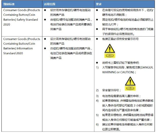 紐扣或硬幣電池可以在各種各樣的產品中找到,包括兒童玩具、照明產品、遙控器、手表等。電玩具一般使用的紐扣/硬幣電池為扁平的圓形單電池,厚度從1-11毫米不等,直徑可達32毫米。在玩耍電玩具時,兒童如果不慎吞食紐扣/硬幣電池后可導致窒息甚至死亡。2020年12月22日,澳大利亞政府正式生效4個強制標準來減少因使用紐扣/硬幣電池造成的傷亡風險。強制性標準包括18個月過渡期,從2022年6月22日開始,供應商必須符合該標準要求。