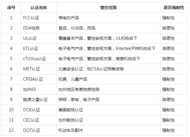 對于常見產品出口美國所需的認證大概有這12類: