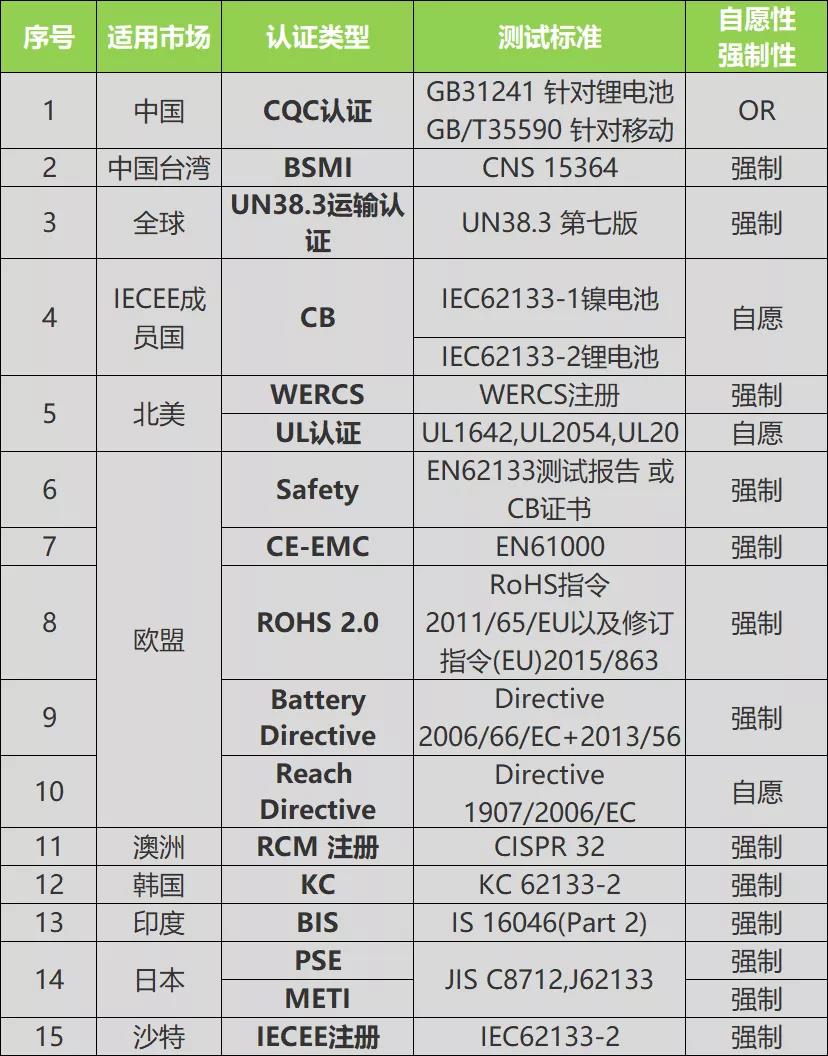 電池的使用在人們生活中十分常見并且非常重要。高質量的、安全的電池產品對各行各業和消費者來說,也是非常的關注。那么我們怎么判定電池是否安全呢?每個市場對于安全的標準都不一樣,下面我們看一下電池產品進入不同市場需要具備的質量標準認證類型: