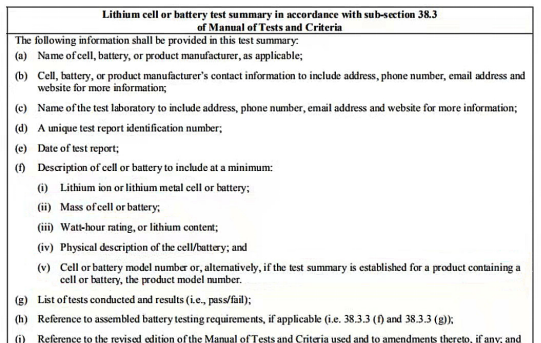 關于鋰電池檢測的第38.3章節的部分內容修訂有兩處: "i驗概要Lithium cell and battery testsummary" 中: 38.3.5()(i)原"質量(Mass) "更改為“電池或電池組質量(Mass of cell orbattery) ";