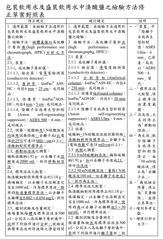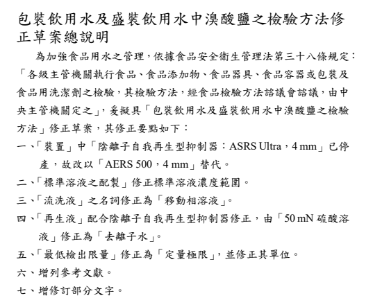 2022年5月23日,臺灣衛(wèi)福部食藥署發(fā)布衛(wèi)授食字第1111900735號公告,預(yù)告修正「包裝飲用水及盛裝飲用水中溴酸鹽之檢驗方法」草案。 其修正要點如下: